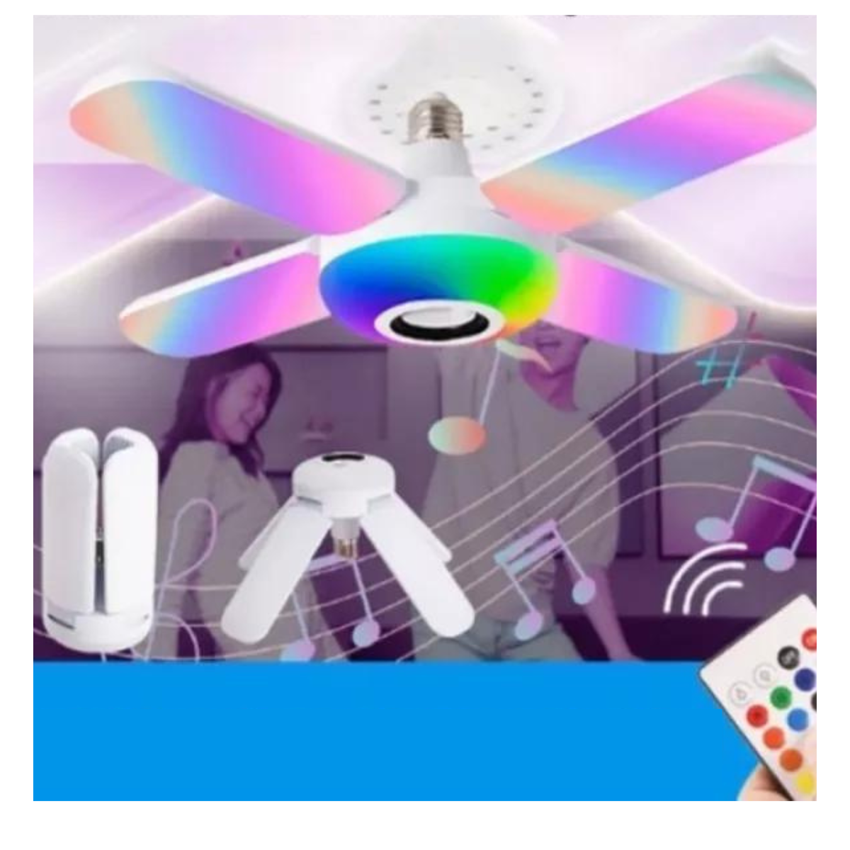 Más que una simple bombilla, la Lampara LED RGB 4 Aspas Extensibles es una experiencia multisensorial (cuenta con capacidad de bluetooth para tu música favorita), que te permite crear ambientes únicos, puedes darle un toque de estilo a tu hogar. ¡Despierta tus sentidos con la fusión perfecta de luz o estilo! Ilumina tu espacio con una experiencia multisensorial:- Iluminación personalizada: Crea el ambiente perfecto para cada ocasión ajustando el color y la intensidad de la luz. Desde un cálido resplandor para relajarse hasta tonos vibrantes para una fiesta, las posibilidades son infinitas.- Alas: Tiene capacidad de desplegar 4 alas para ampliar la luz, es excelente en ambientes anchos.- Resistente: Hecho con materiales de alta calidad, dan prioridad a una larga durabilidad de iluminación, siendo una inversión garantizada. - Temporizador inteligente: Programa la bombilla para que se apague automáticamente después de un tiempo determinado, ideal para crear un ambiente relajante antes de dormir o para eventos con temporizador.- Compatibilidad universal: Se adapta a la mayoría de los zócalos estándar. Reemplaza fácilmente tu bombilla convencional por esta versión inteligente y transforma tu hogar al instante.